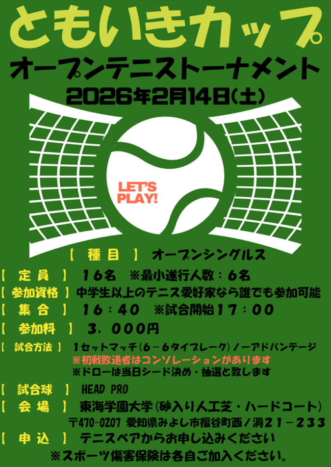 ともいきカップ オープン 2026.02.07 基本情報主催者熱血研究所日時2026年2月14日(土) 16時40分申込情報申込URL詳細はこちら会場情報会場名愛知県東海学園大学住所 愛知県みよし市福谷町西ノ洞21-233熱血研究所の試合情報一覧を見る