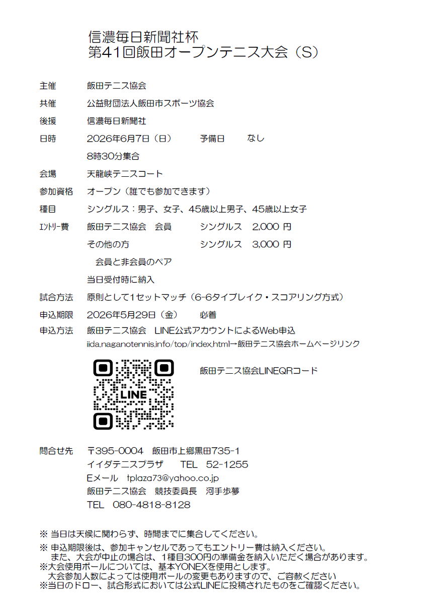 第41回飯田オープンテニス大会(S) オープン 2026.02.17 基本情報主催者飯田テニス協会日時2026年6月7日(日) 9時00分申込情報申込URL詳細はこちら会場情報会場名天竜峡テニスコート住所 長野県飯田市川路5093-5飯田テニス協会の試合情報一覧を見る